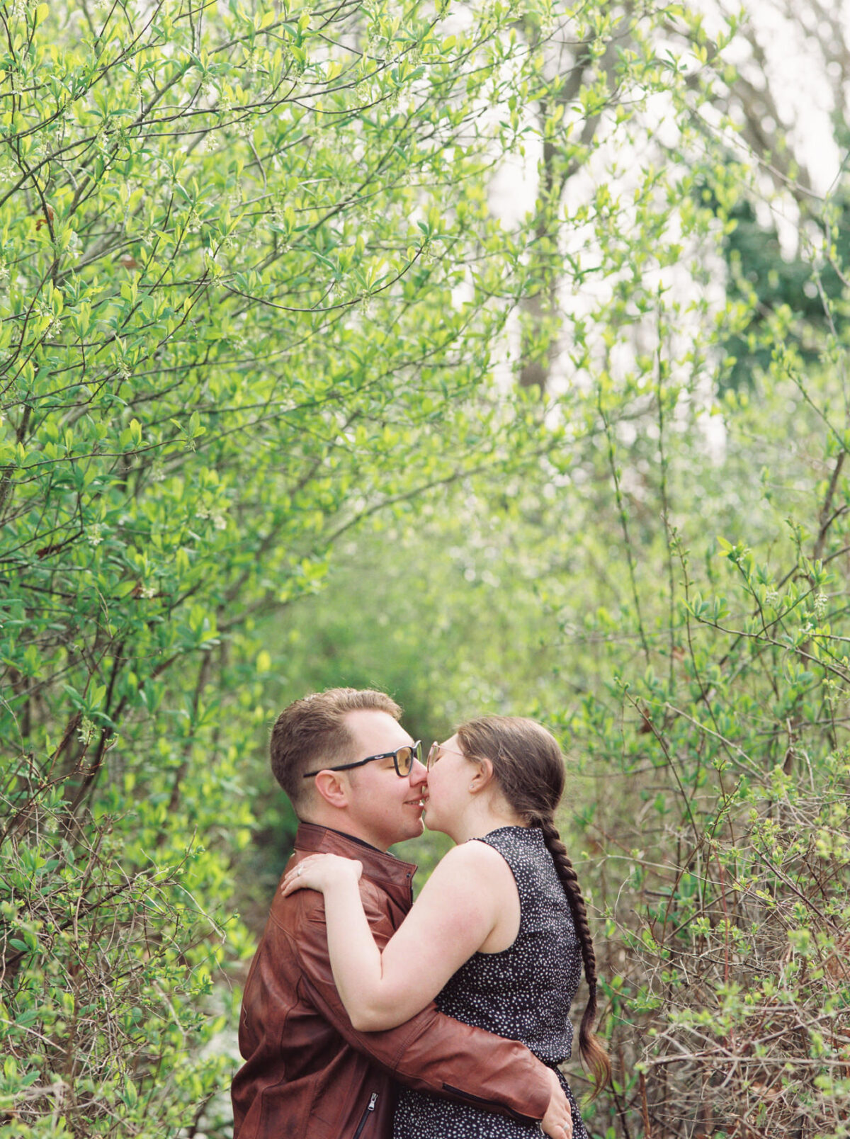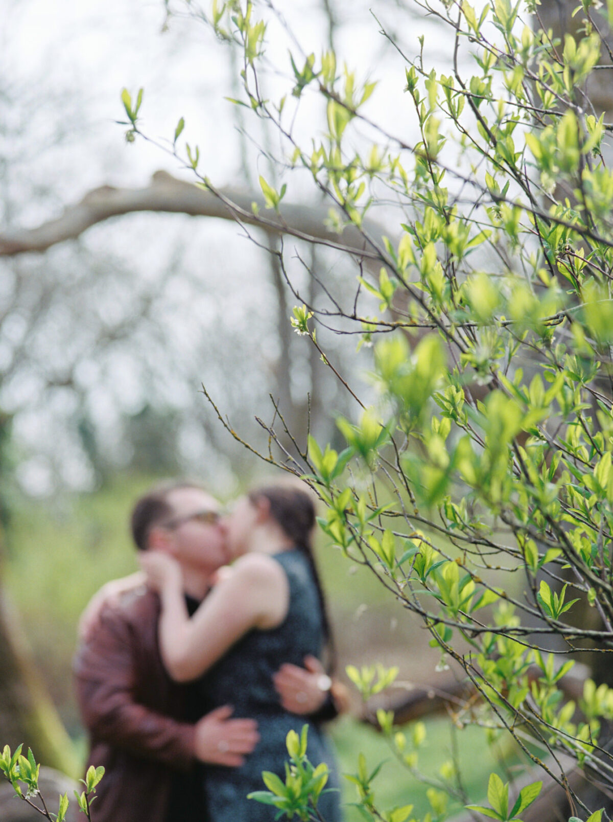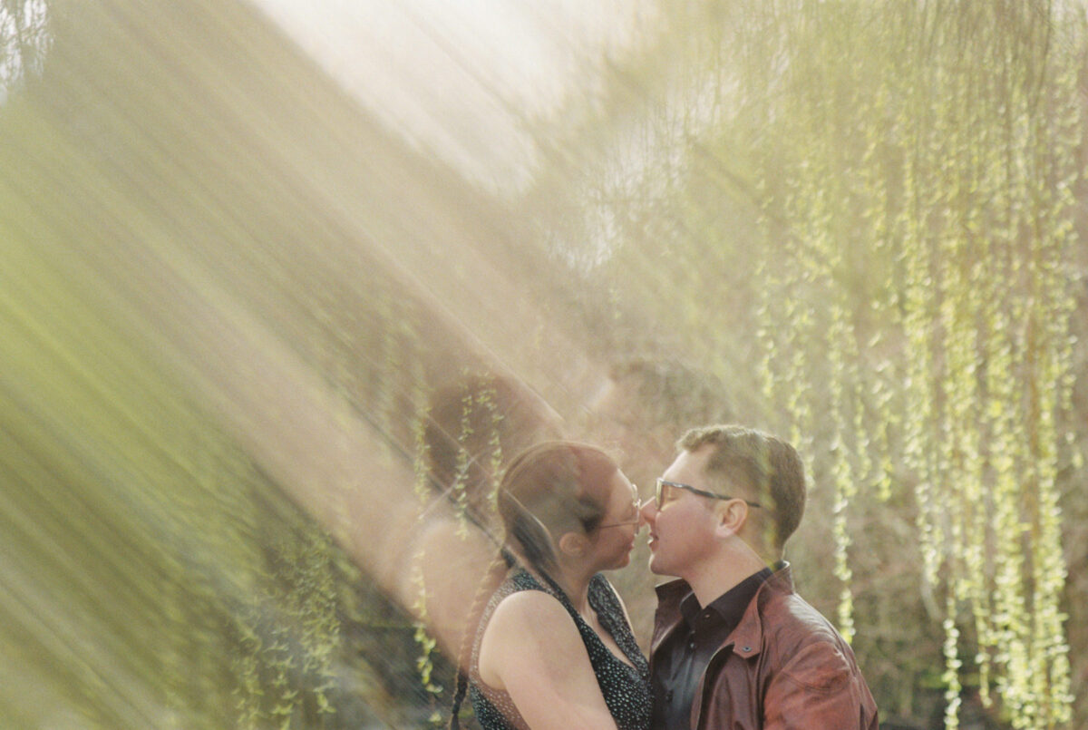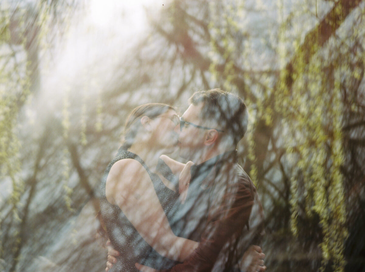 A creative couples engagement portrait of a man and a woman kissing with reflections of a willow tree. This photo was taken with Portra 400 120mm film using a Pentax 645 medium format camera in Victoria BC